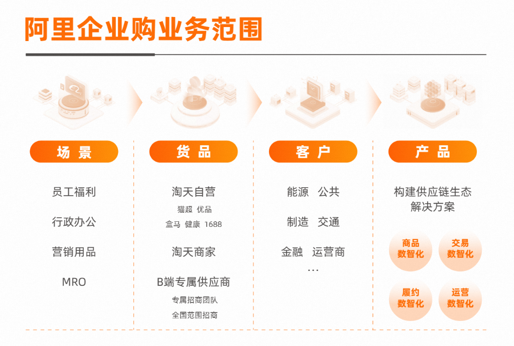 阿里企业购是阿里巴巴集团旗下面向企业客户(包括公司、政府机构、学校、医院等组织)推出的B2B采购服务平台,依托阿里巴巴集团技术和供应链生态资源优势,整合淘宝、天猫、1688、盒马等全系生态供给,面向政企客户提供全链路一站式采购解决方案,以AI智能科技重塑企业采购链路,让企业采购更高效、更省心。