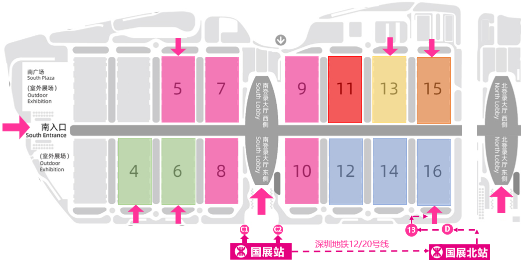 乘坐深圳地铁12/20号线前往国展站C出口或国展北站D出口,出站后可步行到深圳国际会展中心南登录大厅/13号门