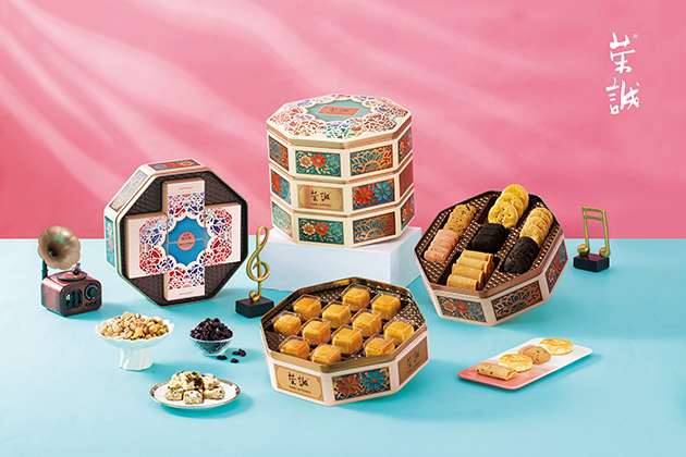 荣诚老家潮汕潮韵系列华章礼盒,以潮汕本土非遗元素漆金木雕为灵感设计,全新三层八角盒设计,给予多种礼食体验,搭配非遗大师手作的潮式月饼,彩虹酥、壳桃糕点,经典饼食,礼盒口味配置丰富,彰显系列高端之作。